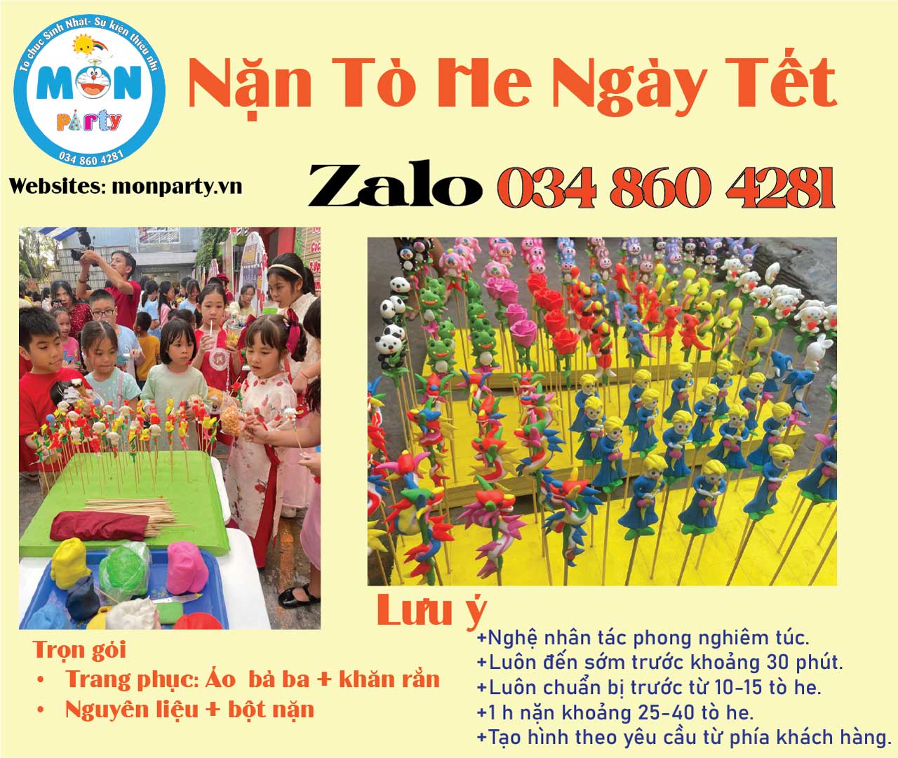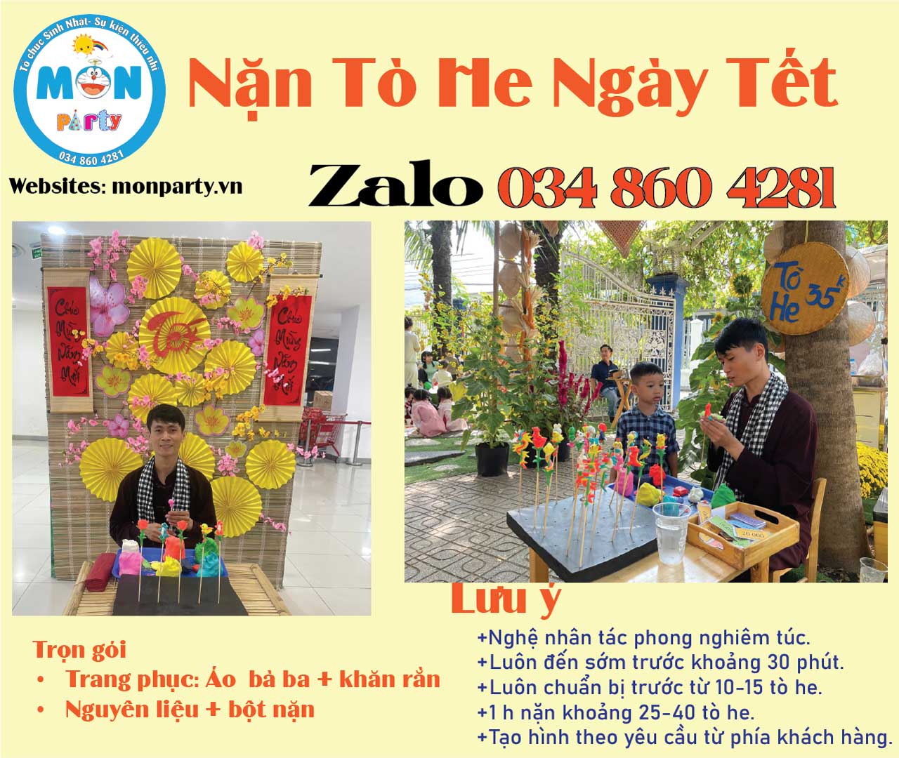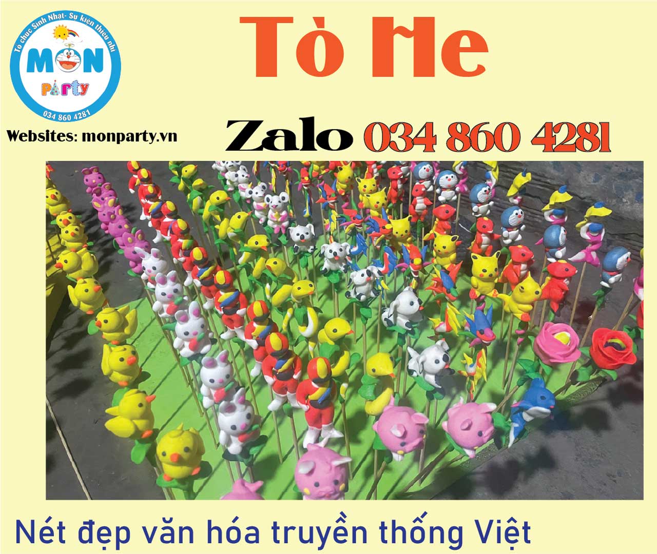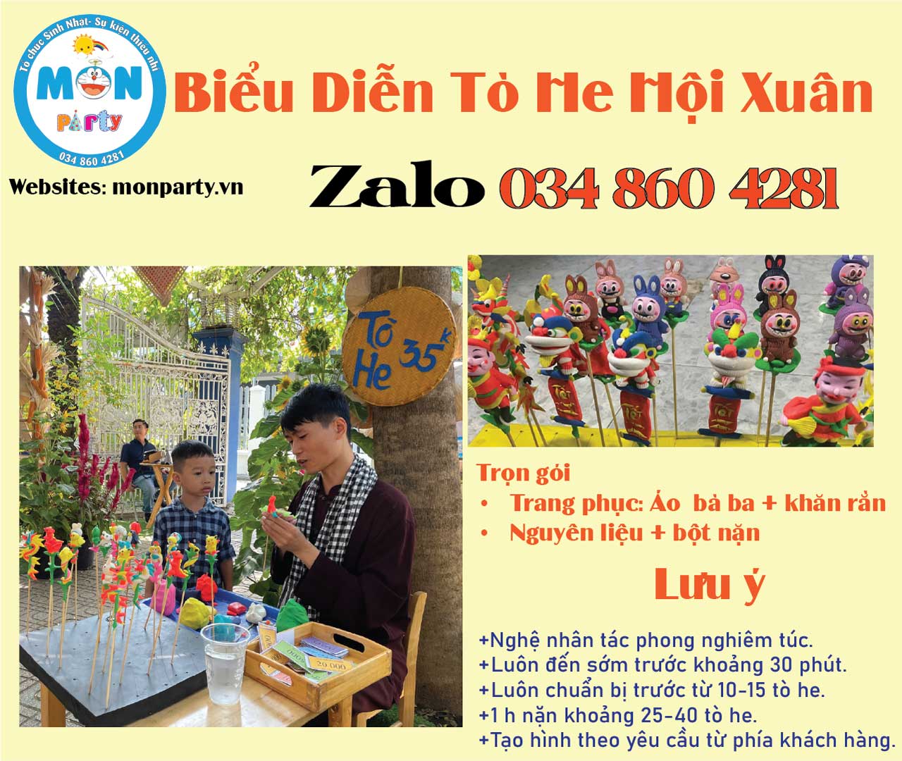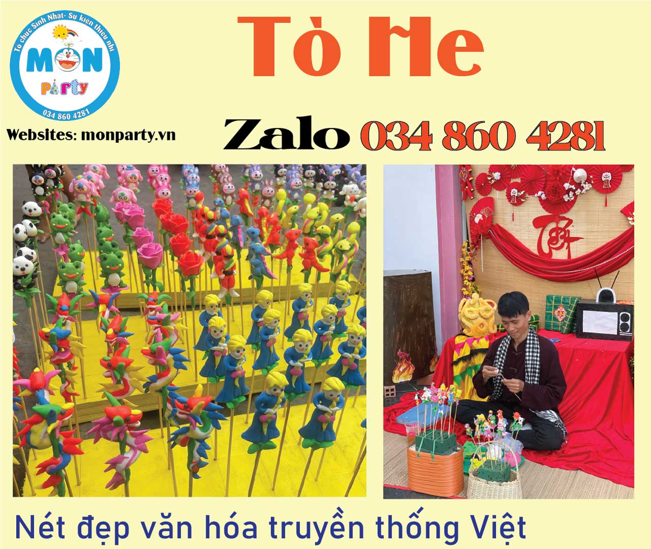 Báo Giá thuê Tò He HCM và các tỉnh lân cận tại đơn vị Monparty. Là giá cho thuê nghệ nhân tò he biểu diễn chuyên nghiệp. Monparty nhận cung cấp dịch vụ tò he trọn gói. Bao gồm nghệ nhân biểu diễn, trang phục áo bà ba khăn rằn, nguyên liệu bột nếp, dụng cụ … Một số chương trình mà quý khách có thể lựa chọn tiết mục biểu diễn tò he như: