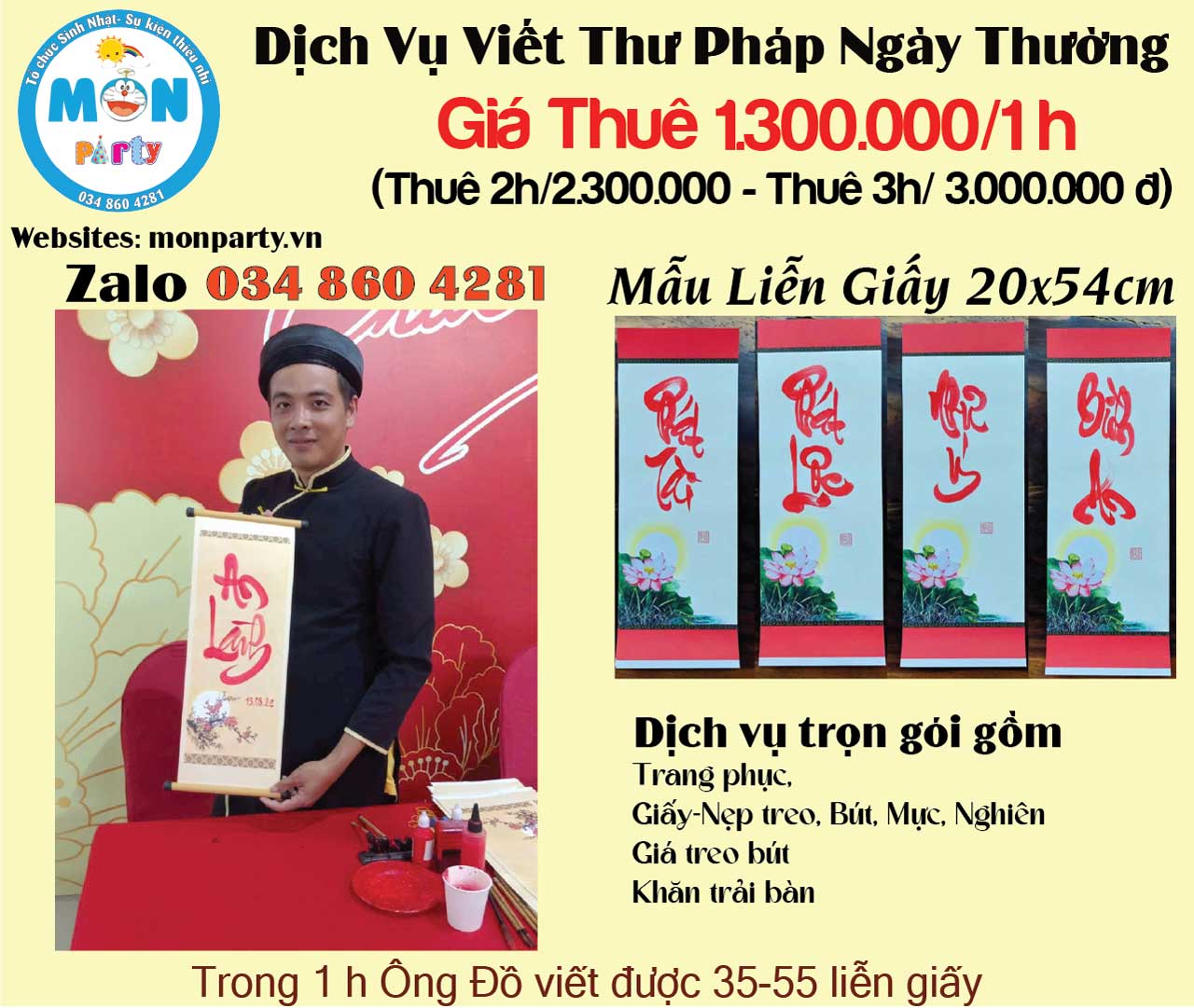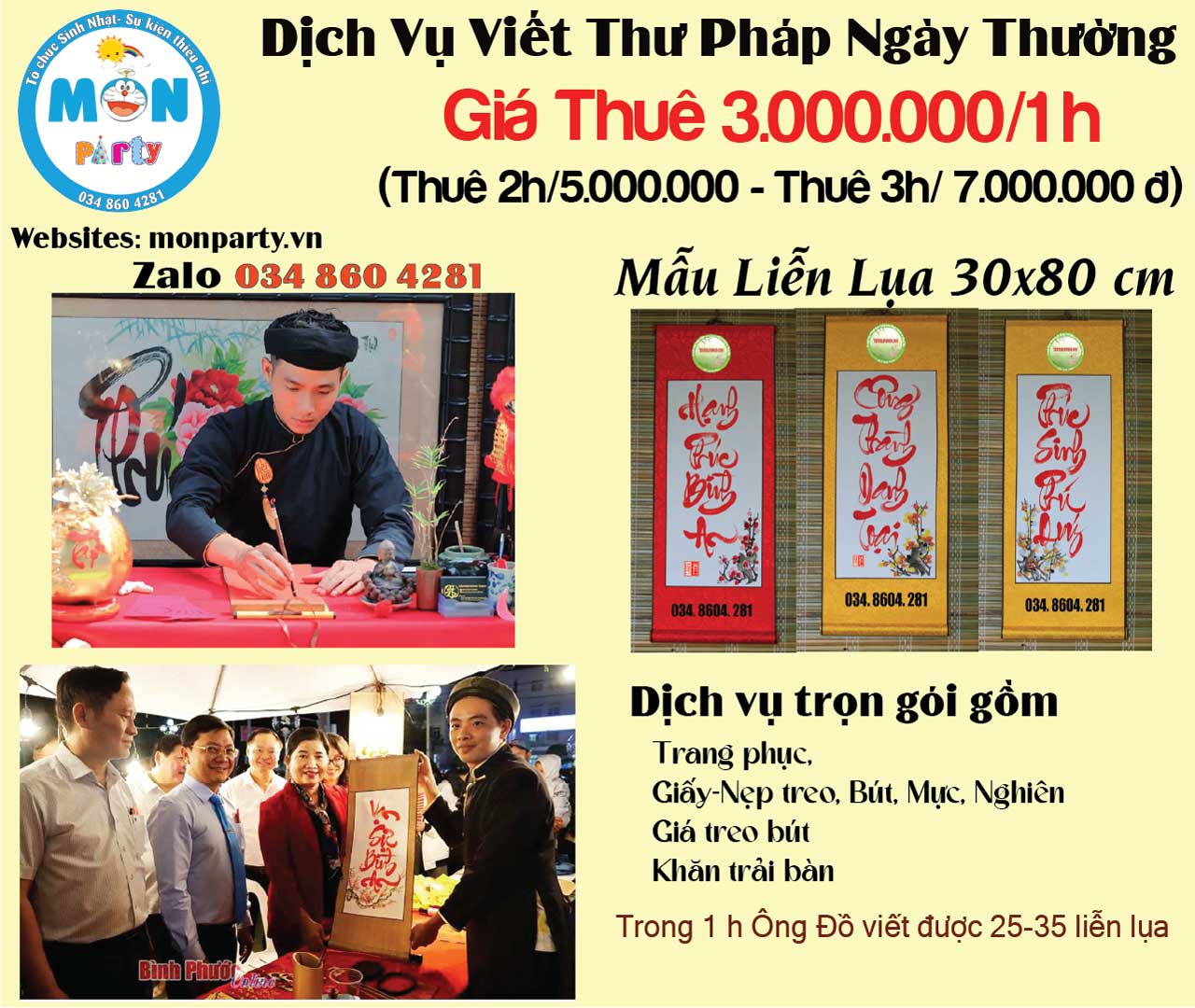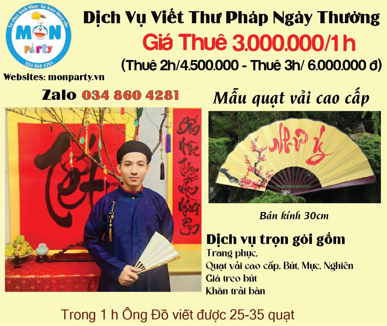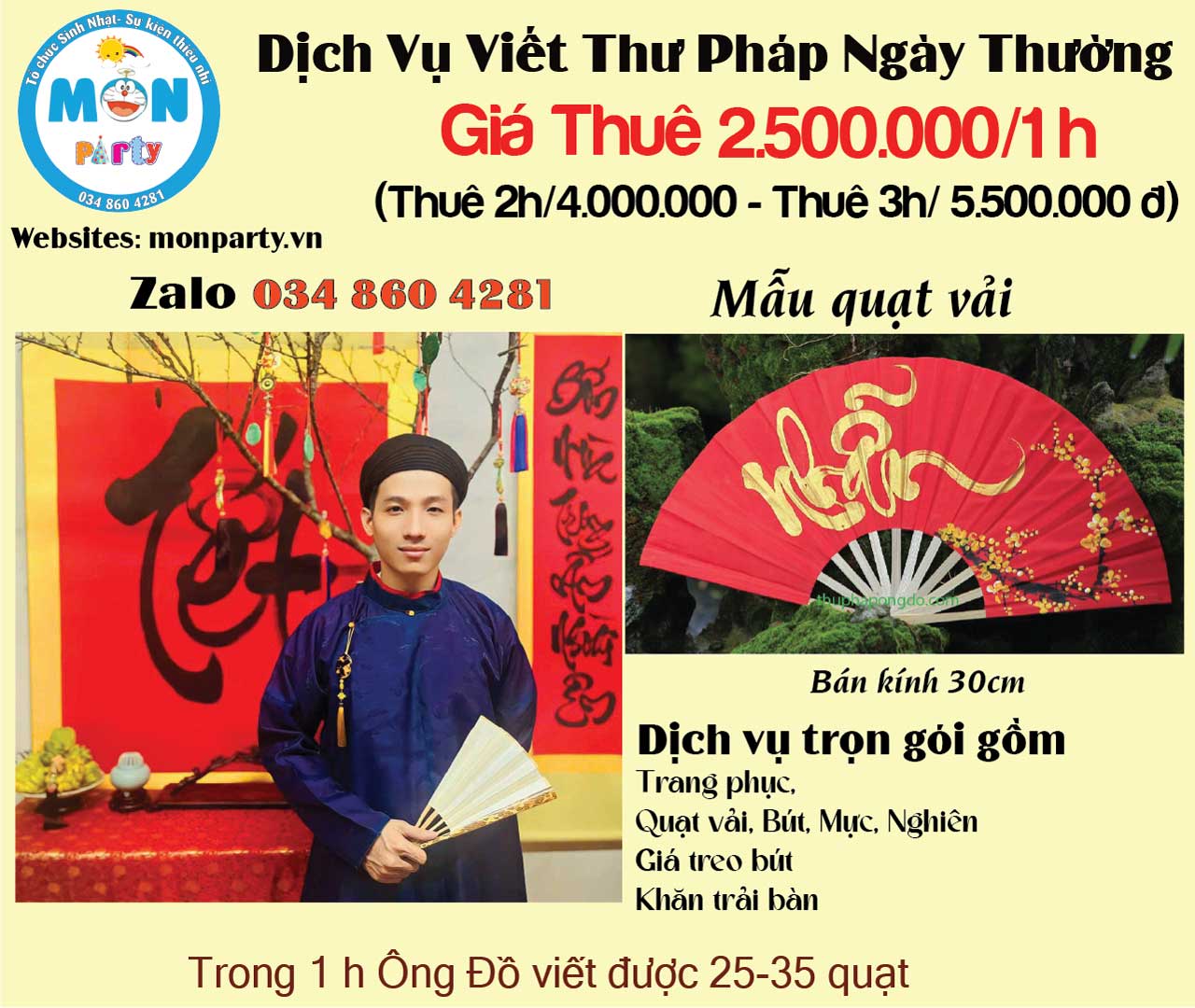 Dịch vụ cho thuê ông đồ Thư pháp tại Mon Party là dịch vụ cho thuê trọn gói. Ông đồ biểu diễn viết thư pháp sẽ tự chuẩn bị trang phục, giấy liễn, nẹp treo, bút viết, bàn, khăn trải bàn,…