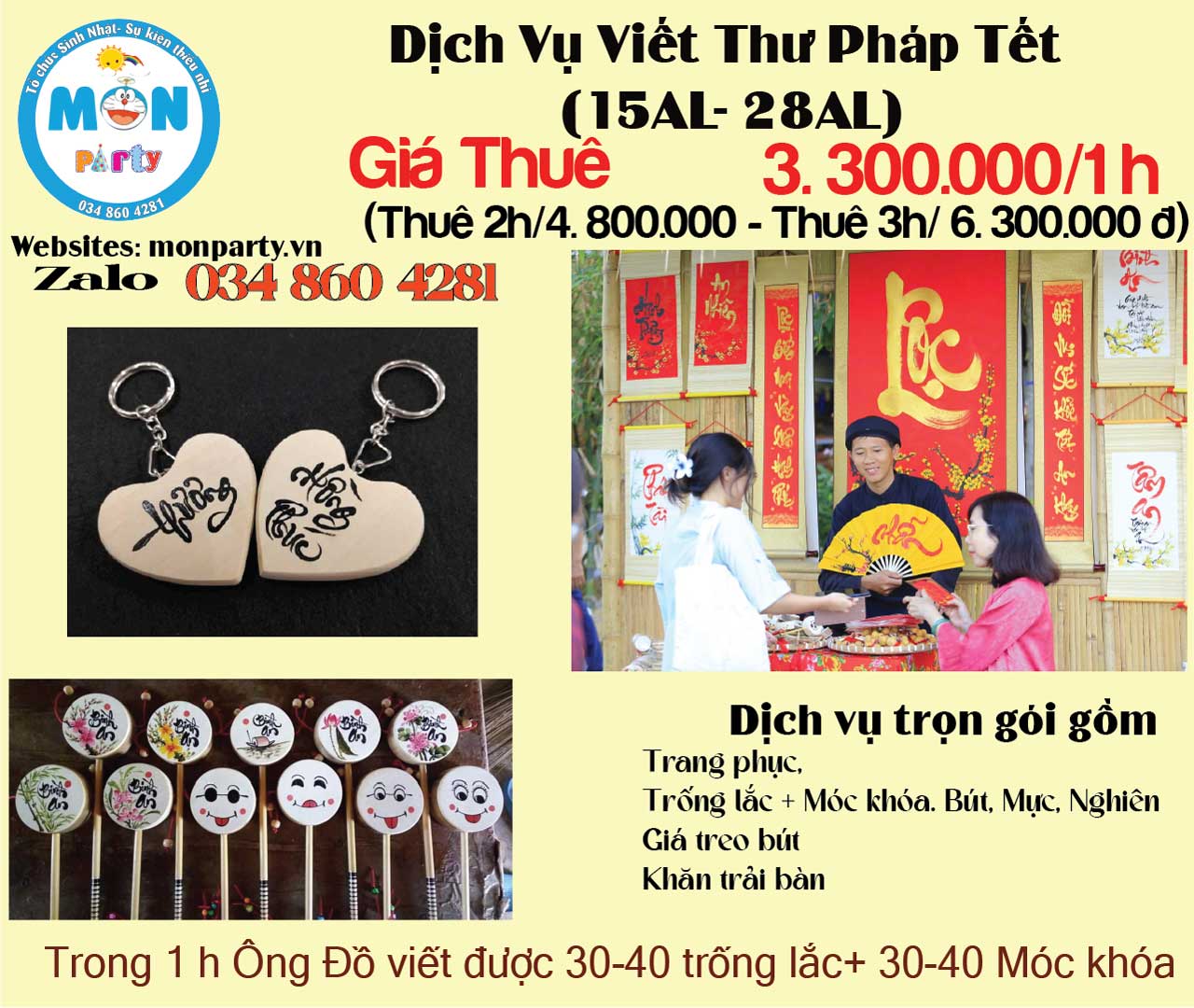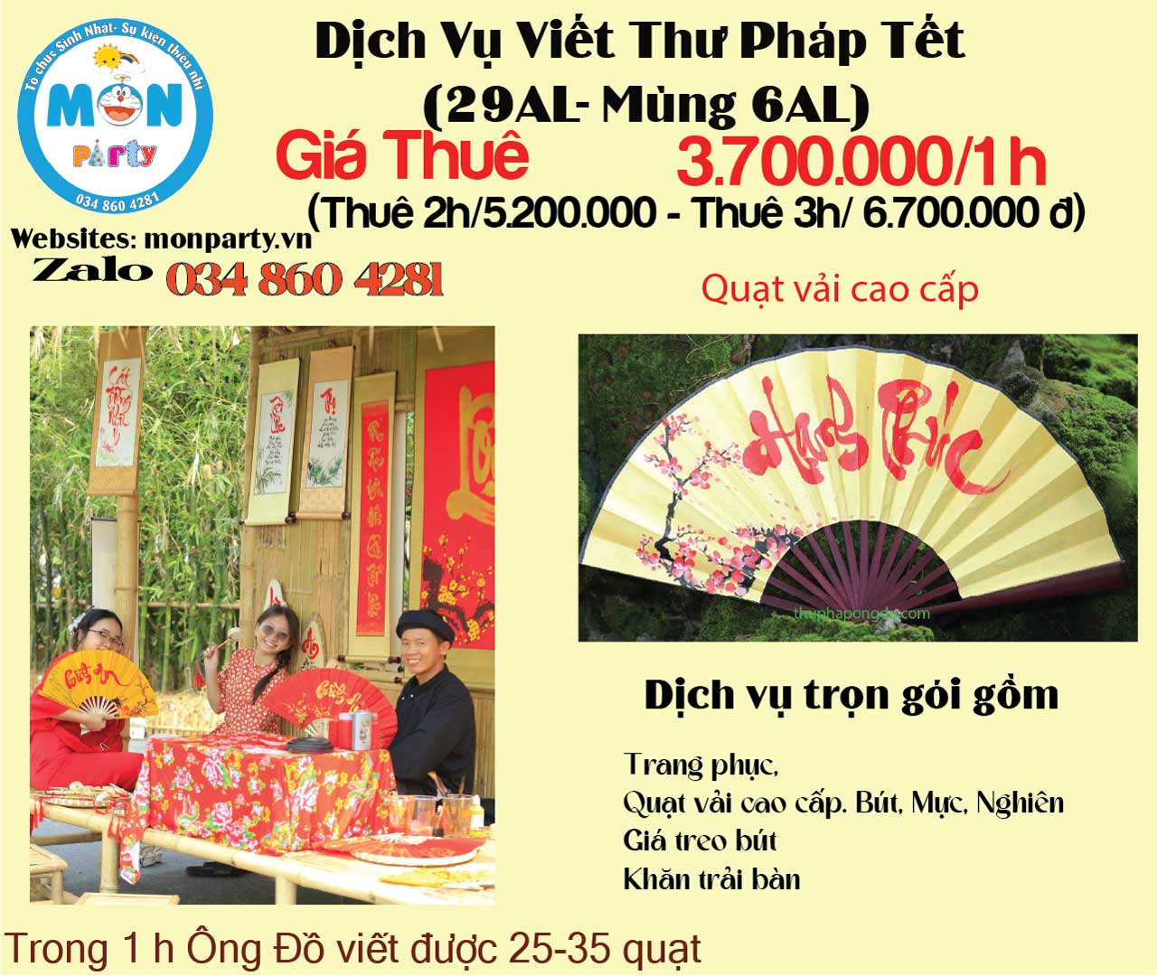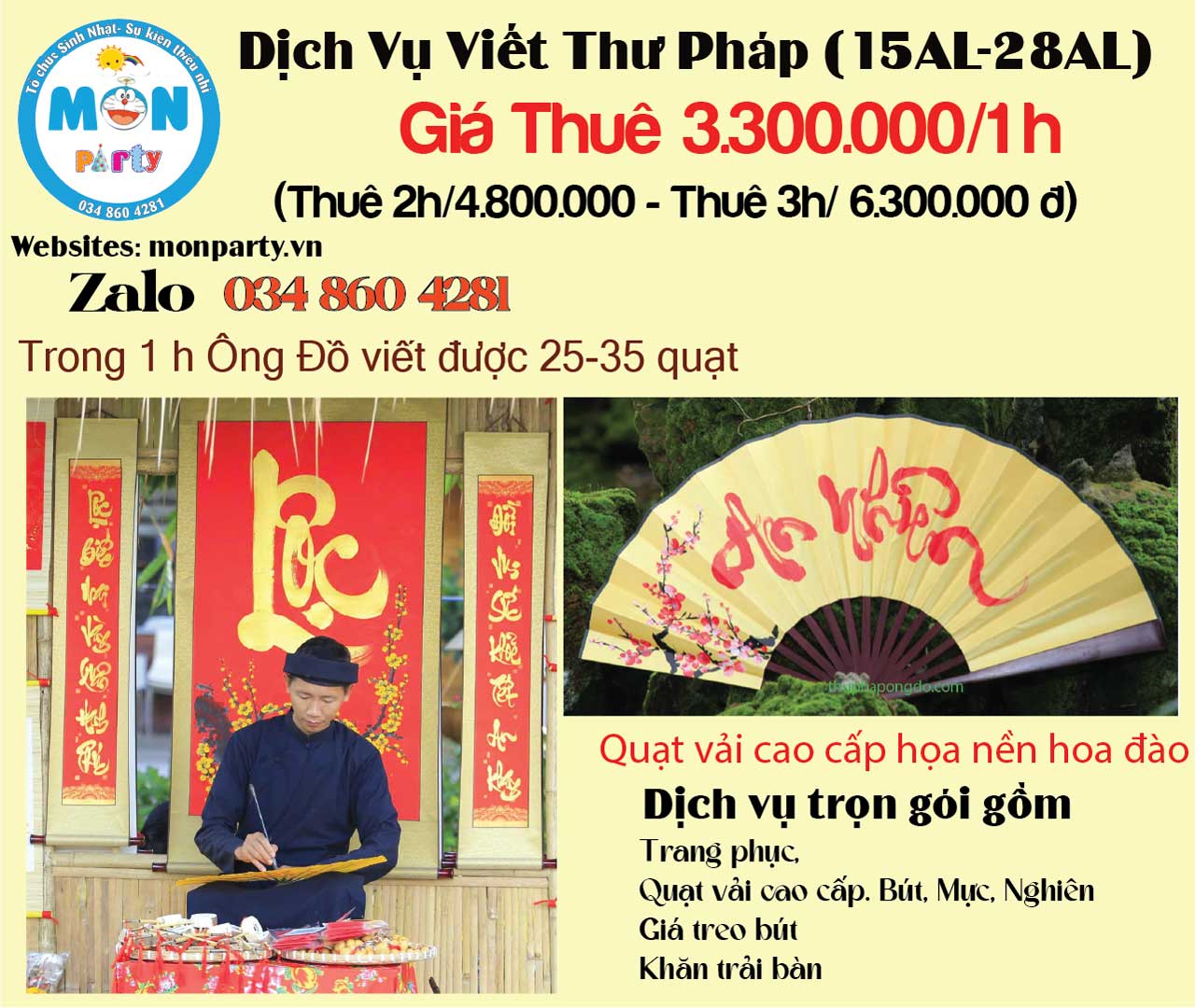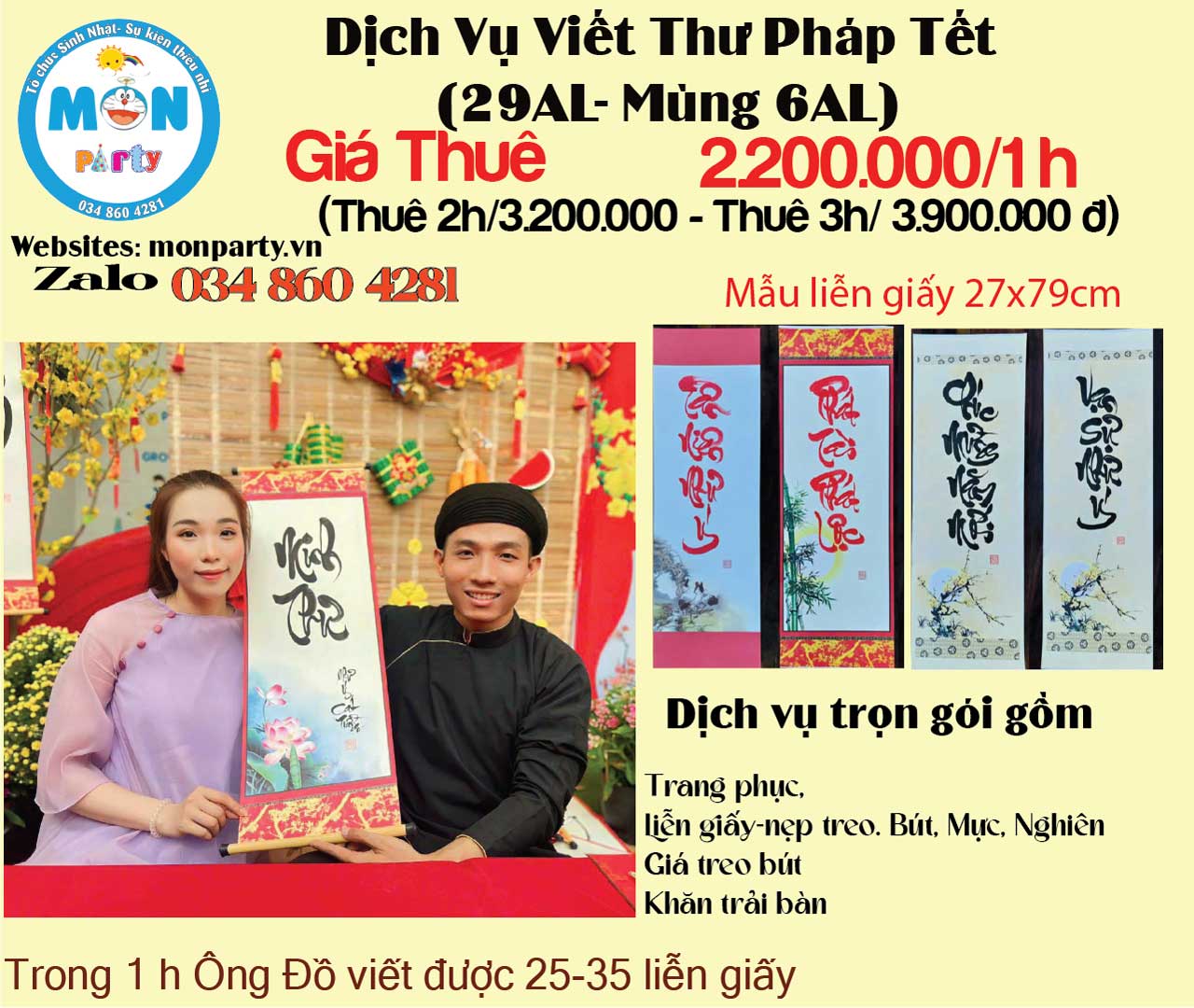 Dịch vụ cho thuê ông đồ Thư pháp tại Mon Party là dịch vụ cho thuê trọn gói. Ông đồ biểu diễn viết thư pháp sẽ tự chuẩn bị trang phục, giấy liễn, nẹp treo, bút viết, bàn, khăn trải bàn,…