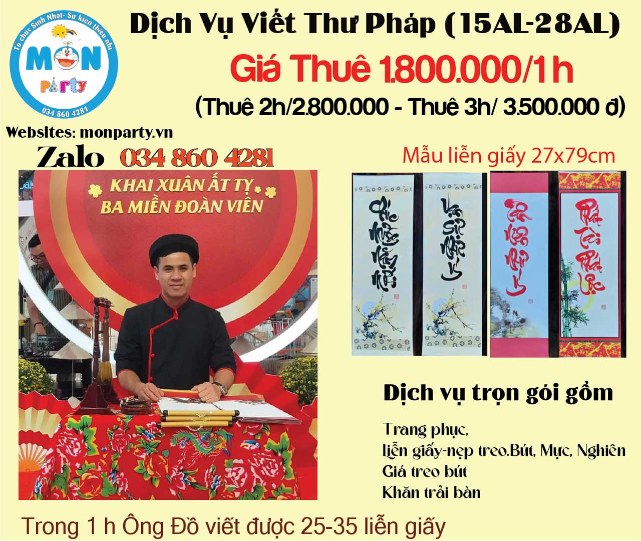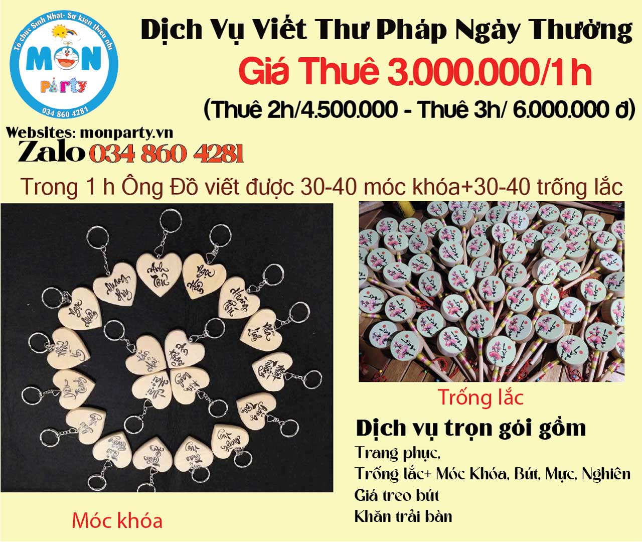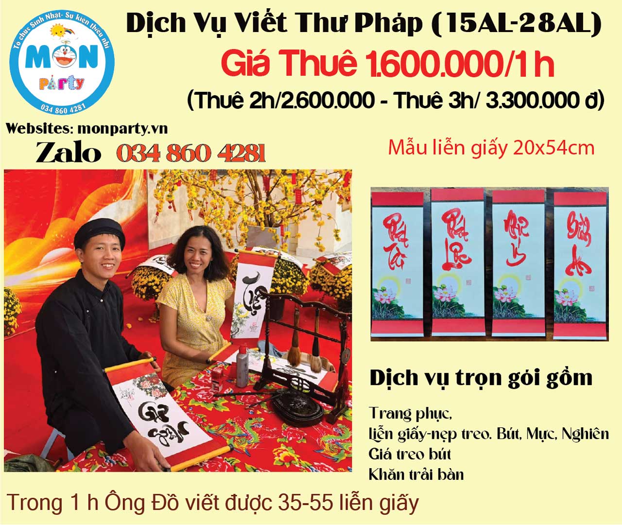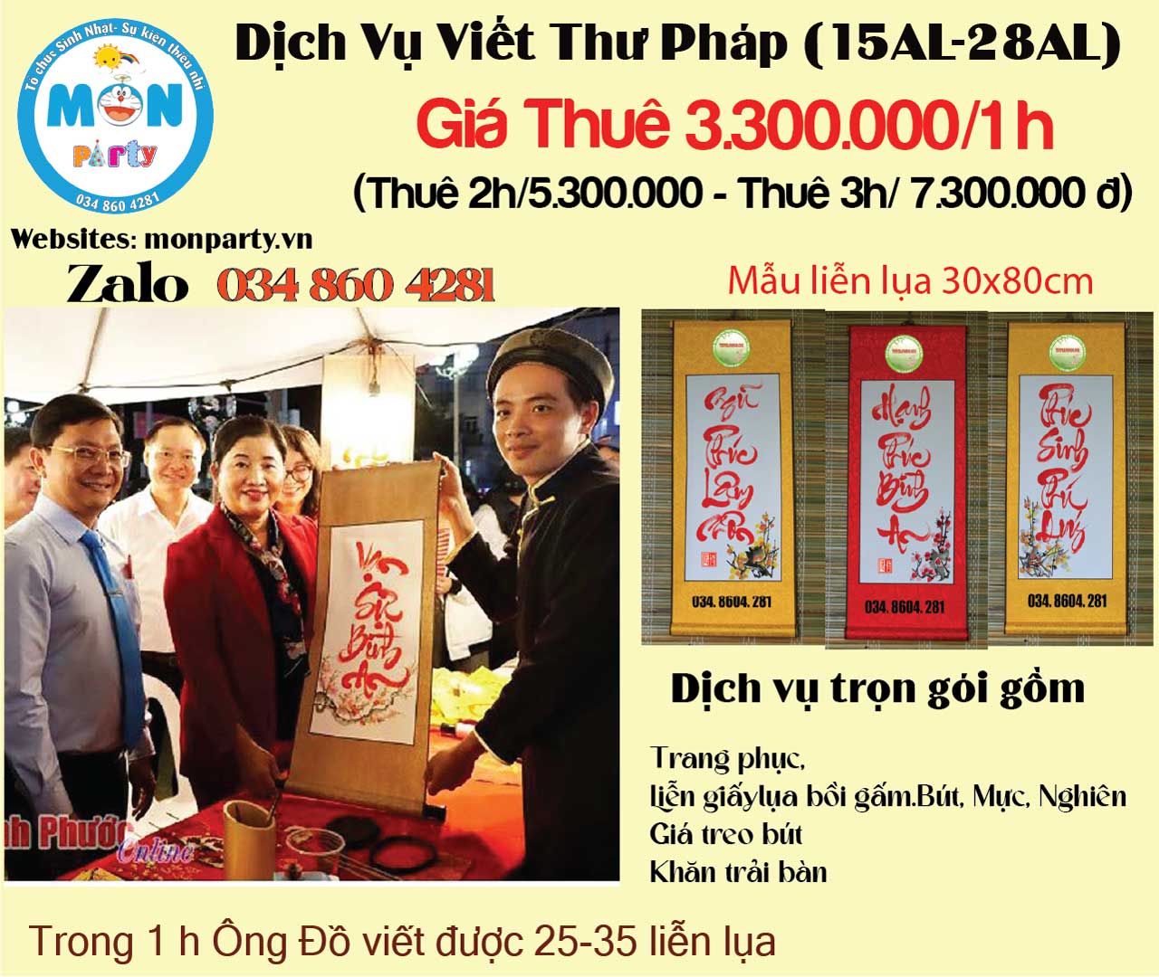Dịch vụ cho thuê ông đồ Thư pháp tại Mon Party là dịch vụ cho thuê trọn gói. Ông đồ biểu diễn viết thư pháp sẽ tự chuẩn bị trang phục, giấy liễn, nẹp treo, bút viết, bàn, khăn trải bàn,…