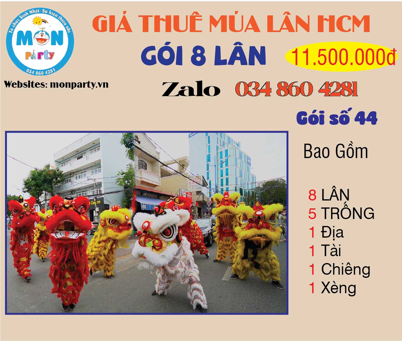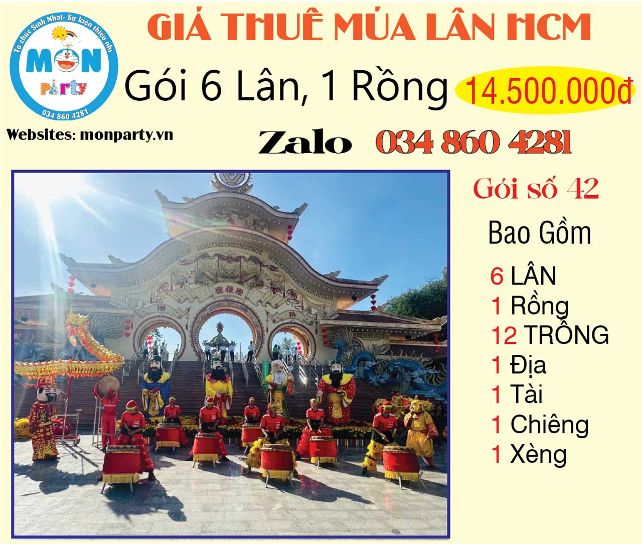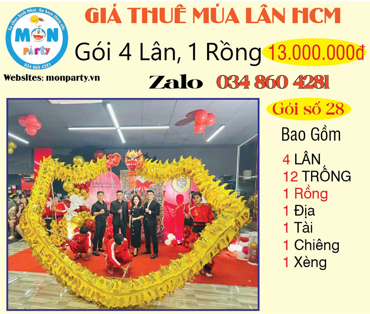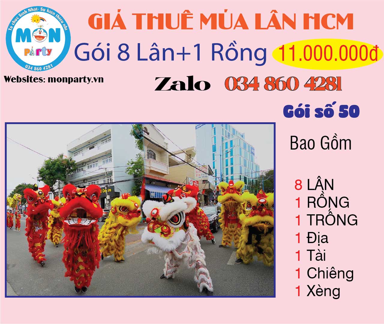 - Giá đã bao gồm đội lân – trống – đạo cụ đầy đủ