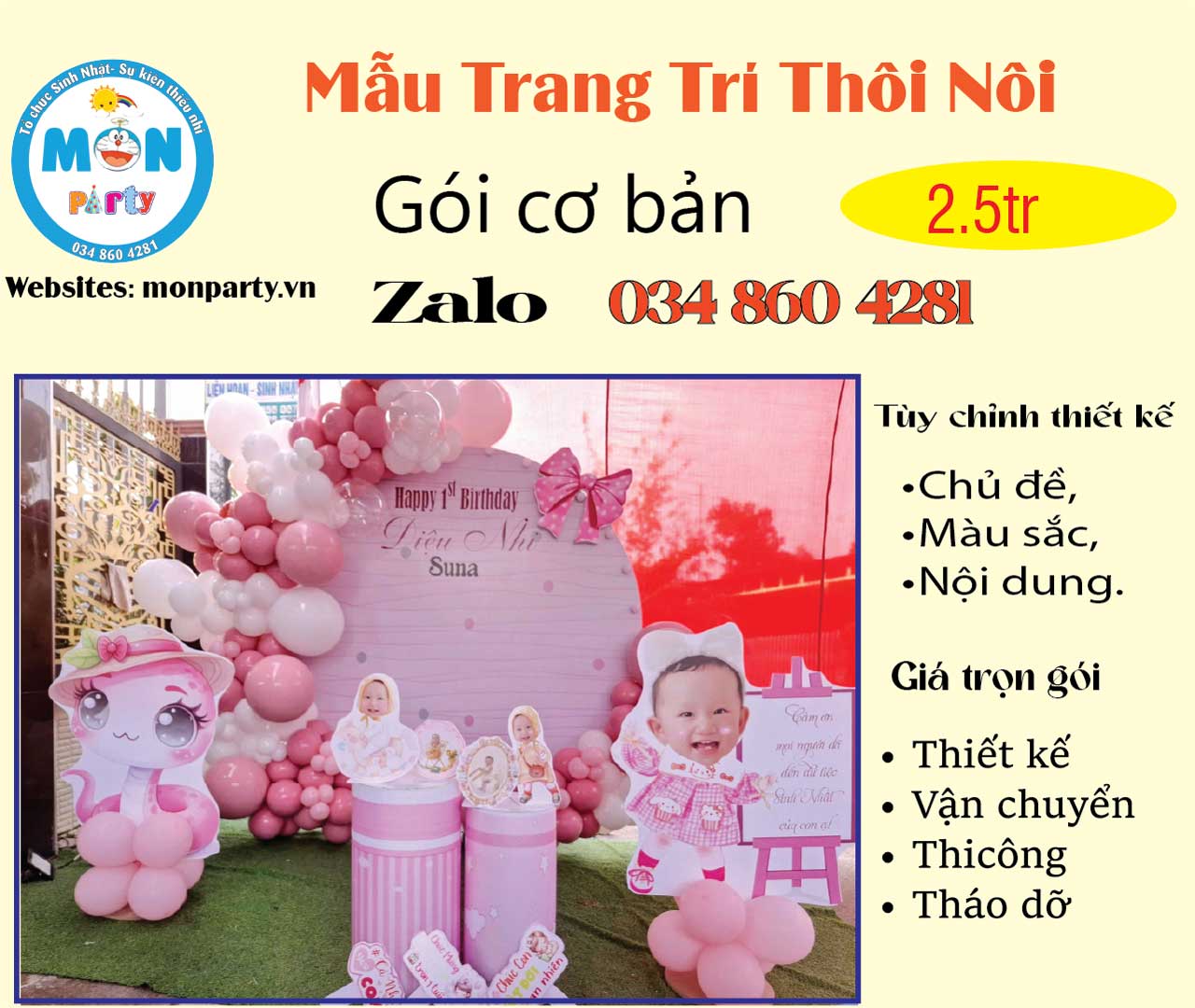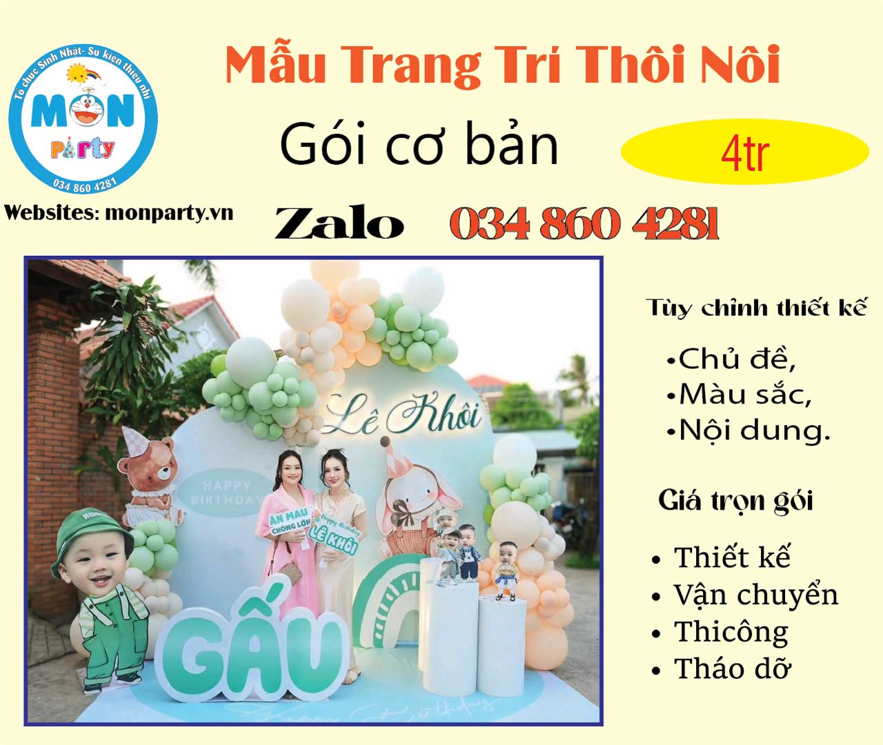 Monparty là đơn vị chuyên thiết kế, tổ chức trang trí thôi nôi cho bé tại nhà. Chúng tôi chuyên cung cấp dịch vụ tại TP.HCM và Bình Dương.