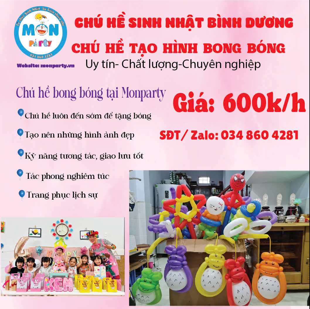 Monparty là đơn vị chuyên cung cấp chú hề tổ chức sinh nhật cho bé tại Bình dương. Để tố chức sinh nhật cho bé một cách chuyên nghiệp và bài bản nhất. Quý khách hàng hãy liên hệ ngay với chúng tôi để được tư vấn và đặt lịch một cách chi tiết nhất nhé.