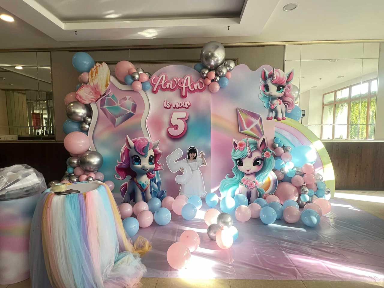 Trang trí sinh nhật chủ đề ngựa unicorn rất được các bé gái và phụ huynh lựa chọn.